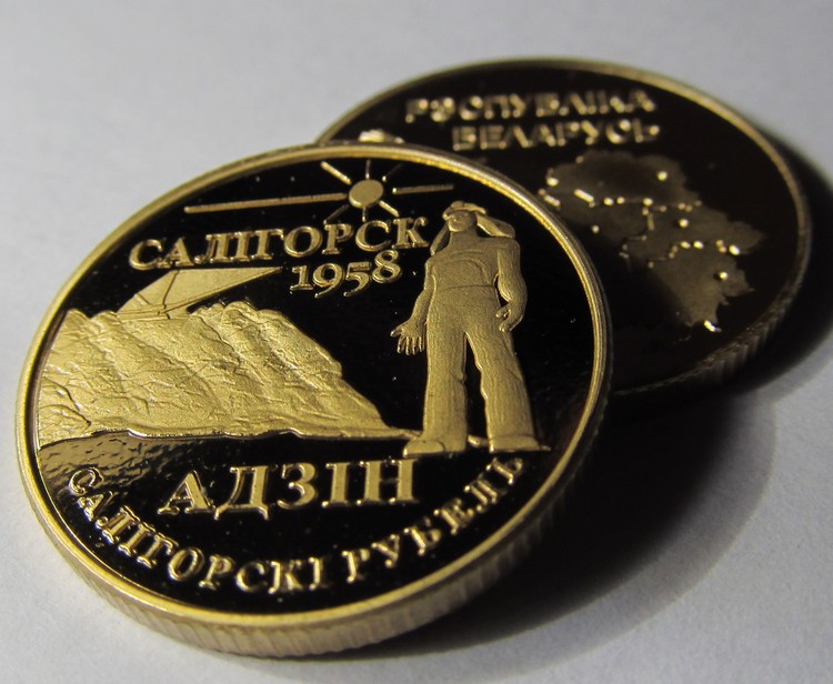 Упершыню на манеце не было герба горада. Кіраўніцтва райвыканкама не дало згоды на выкарыстанне герба ў атрыбутыцы «Салігорскага